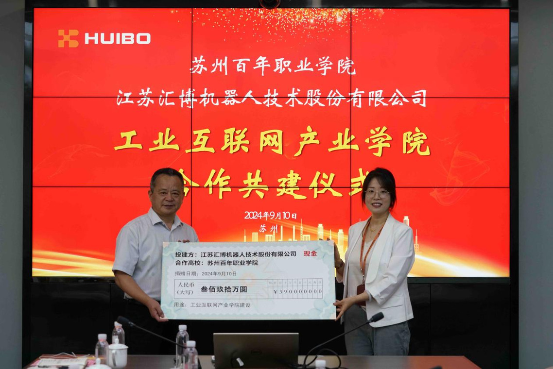 袁芳表示,加强校企合作是汇博机器人产业链发展的重大战略之一,百年学院作为全国第一所中外合作办学高职院校,汇博机器人愿与学校建立长效合作机制,共同探索职业教育领域校企合作新模式。袁芳代表汇博机器人承诺,将全力以赴支持产业学院的建设与发展,投入必要的资金和设备,用于改善实训条件和教学设施、设立奖学金与科研基金等;同时,汇博机器人还将派遣经验丰富的技术专家和管理人员,参与产业学院的教学与管理,为学生提供实习实训和职业规划指导。与百年学院携手共建工业互联网产业学院是共同推进职业教育改革创新道路上的一件重事、大事,期待双方在合作中深化交流、不断探索,共同将产业学院项目做深做实。