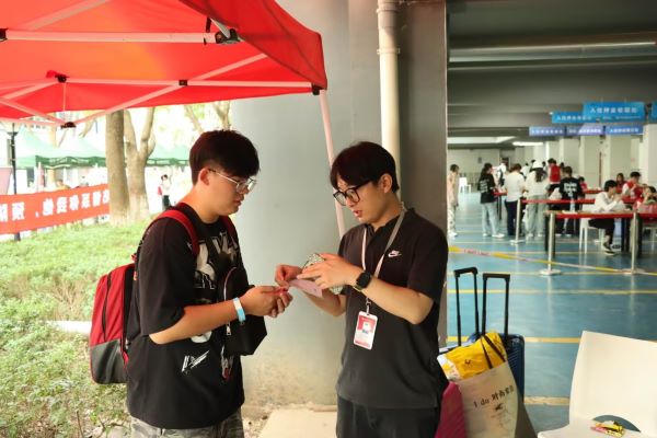 当新生与家长踏入宿舍区,迎接他们的是另一批早已等候多时的志愿者。主动上前,帮助新生和家长搬运沉重的行李,一句句贴心的指引让初来的新生感受到了家的温暖。同时,志愿者们还细心地告知学生宿舍楼号、房间号及生活设施的使用方法,确保每位新生都能迅速适应新环境。
