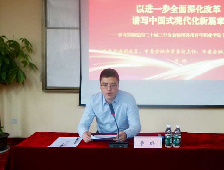 为深入学习宣传贯彻党的二十届三中全会精神,根据苏州市委宣传部的总体安排,市委宣讲团成员、市委金融办常务副主任、市委金融工委常务副书记曹晔同志于9月25日走进金沙官网作宣讲报告。学校部分校领导、职能部门负责人、基层党组织书记及教师和学生代表共200余人参加宣讲会。党委书记孙红军主持宣讲会。