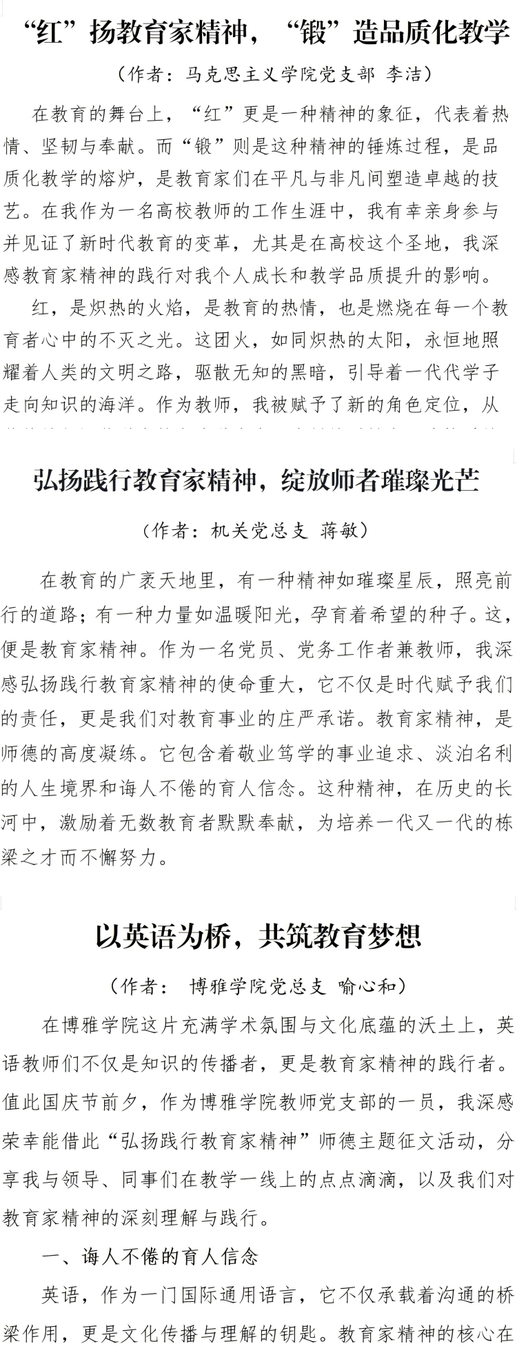 为深入学习和弘扬教育家精神,加强教职人员师德师风建设,提升教师的教育理念和人文素养,金沙官网于近期举办了“弘扬教育家精神”征文活动。此次征文比赛得到了各基层党组织的积极响应,纷纷踊跃投稿。